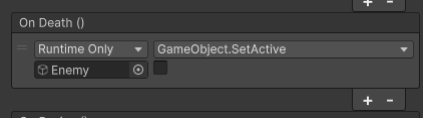 - Añade el script “HealthSystem“. Desactiva la regeneración y la invulnerabilidad. En el evento “On Death” dá clic en el ícono de “más” (+) y añade este mismo objeto “Enemy” y selecciona la función “SetActive” (GameObject→SetActive); esto hará que el enemigo se desactive (desaparezca de la escena) automáticamente cuando muera.